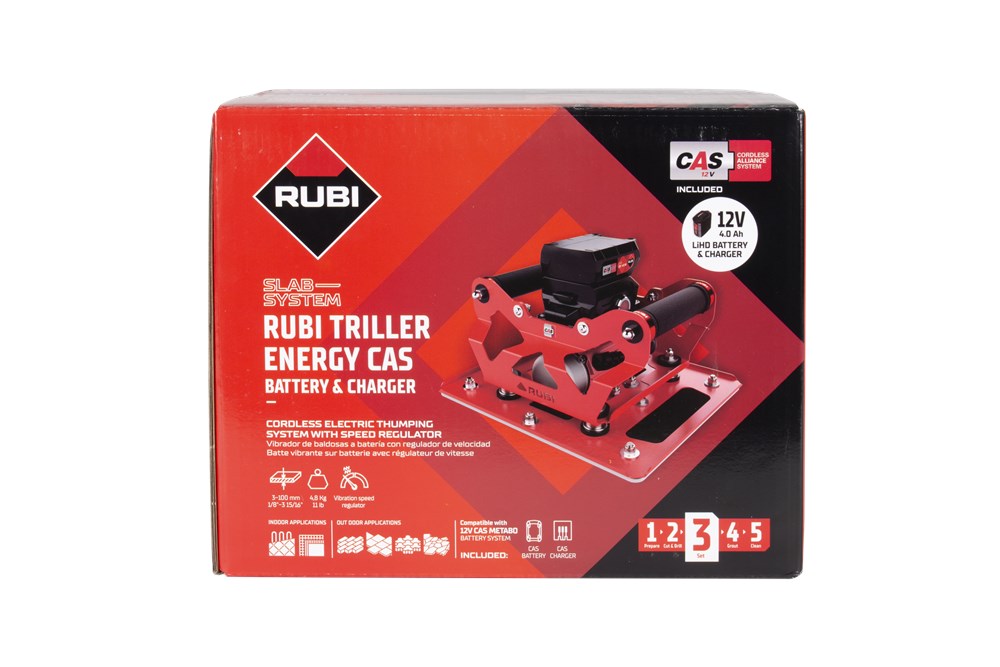 De RUBI TRILLER ENERGY CAS is een op accu werkende tegelklopper. Hij is licht en compact en is speciaal ontworpen om grootformaat tegels en ontkoppelingsmatten eenvoudiger in de lijm te laten zakken.De RUBI TRILLER ENERGY CAS wordt vooral aanbevolen voor het plaatsen van grootformaat tegels en keramische platen. Vooral voor formaten groter dan 300 cm x 100 cm, maar is al bruikbaar bij tegelformaten vanaf 80 x 80 cm. Hij kan ook worden gebruikt voor de installatie en correcte bevestiging van ontkoppelingsmatten.Het beperkte gewicht van de RUBI TRILLER ENERGY CAS - slechts 5,8 kg - en het snoerloze systeem, vergemakkelijken het gebruik in verticale oppervlakten en werken op hoogte. Daarnaast is het ontwerp van het chassis voorzien van een systeem om trillingen te dempen. De dubbele handgreep met softgrip biedt meer ergonomie en comfort voor de gebruiker, en de geometrie vergemakkelijkt een betere controle en stabiliteit van dit gereedschap.De trilplaat heeft een beschermende laag en laat daardoor geen sporen na op het te bewerken oppervlak. De plaat is gemakkelijk te vervangen, en heeft een snelheidsregelaar om de trilling aan te passen aan het materiaal en de ondergrond waarop gewerkt wordt.De RUBI TRILLER ENERGY CAS wordt aangedreven door een 12 V 4 Ah Li-HD accu (die compatibel is het METABO CAS systeem en te gebruiken is voor verschillende merken). De ENERGY CAS accu heeft een LED-display dat het resterende laadniveau aangeeft. Als het display 4 groene LED's toont, betekent dit dat de accu 100% capaciteit heeft.De RUBI TRILLER ENERGY CAS is wederom een waardevolle toevoeging op het SLAB SYSTEM: het assortiment om de gespecialiseerde professional een compleet en globaal assortiment gereedschappen te bieden, volledig gespecialiseerd in het snijden, zagen en verwerken van grootformaat tegels en keramische platen.