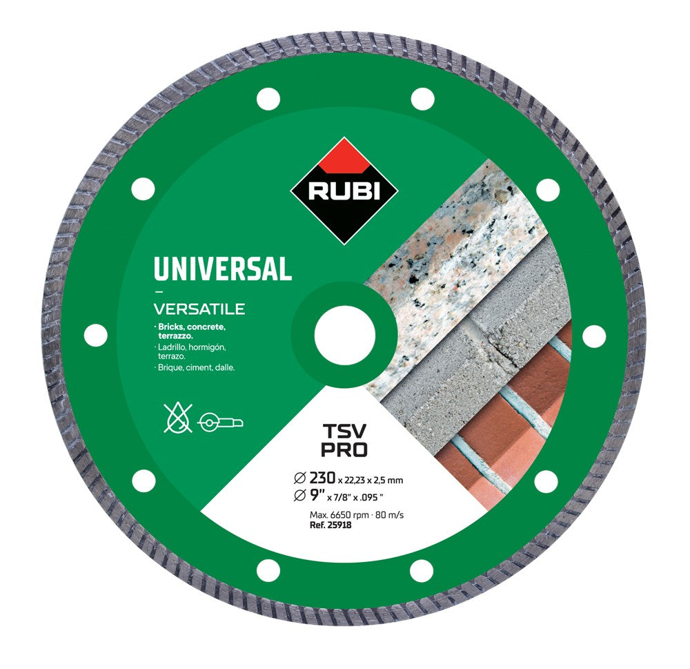 Het TURBO - TSV zaagblad wordt aanbevolen voor het droog zagen met een haakse slijper in algemene bouwmaterialen zoals baksteen, beton en terrazzo.Een geweldige combinatie van hoogwaardige afwerking met een hoge zaagsnelheid.Het type TURBO zaagblad combineert in één blad een scherpe afwerking met een hoge zaagsnelheid.Het gegleufde ontwerp van de TSV zaagbladen geeft de gebruiker een scherpe afwerking in combinatie met een hoge zaagsnelheid.RUBI gebruikt laserlassen om de diamantenrand vast te maken aan het metalen frame.Binnen deze serie zaagbladen heeft RUBI 2 verschillende kwaliteit bladen, De PRO en SUPERPRO.De PRO zaagbladen geeft de gebruiker de beste prijs-kwaliteitverhouding.SUPERPRO bladen zijn als er meer wordt geëist van de zaagbladen in verband met een zwaardere klus.Bladen met een dikte van minder dan 2 mm zijn niet geschikt voor verstek zagen.Bij RUBI weten we hoe we in elk land ter wereld moeten werken, kennen we de eisen van tegelzetters en kennen we alle gebruikte materialen voor installaties en renovaties. Om deze redenen is RUBI een erkend merk en duidelijk gericht op een professionele en zeer veeleisende sector. Daarom stelt RUBI u alle kennis en ervaring ter beschikking om gereedschappen met de hoogste precisie te vervaardigen. De hoge eisen van onze klanten en de markt maken dat wij al onze ervaring gebruiken om gereedschappen en producten voor het snijden, zagen en leggen van keramische tegels op de meest nauwkeurige manier te ontwerpen.