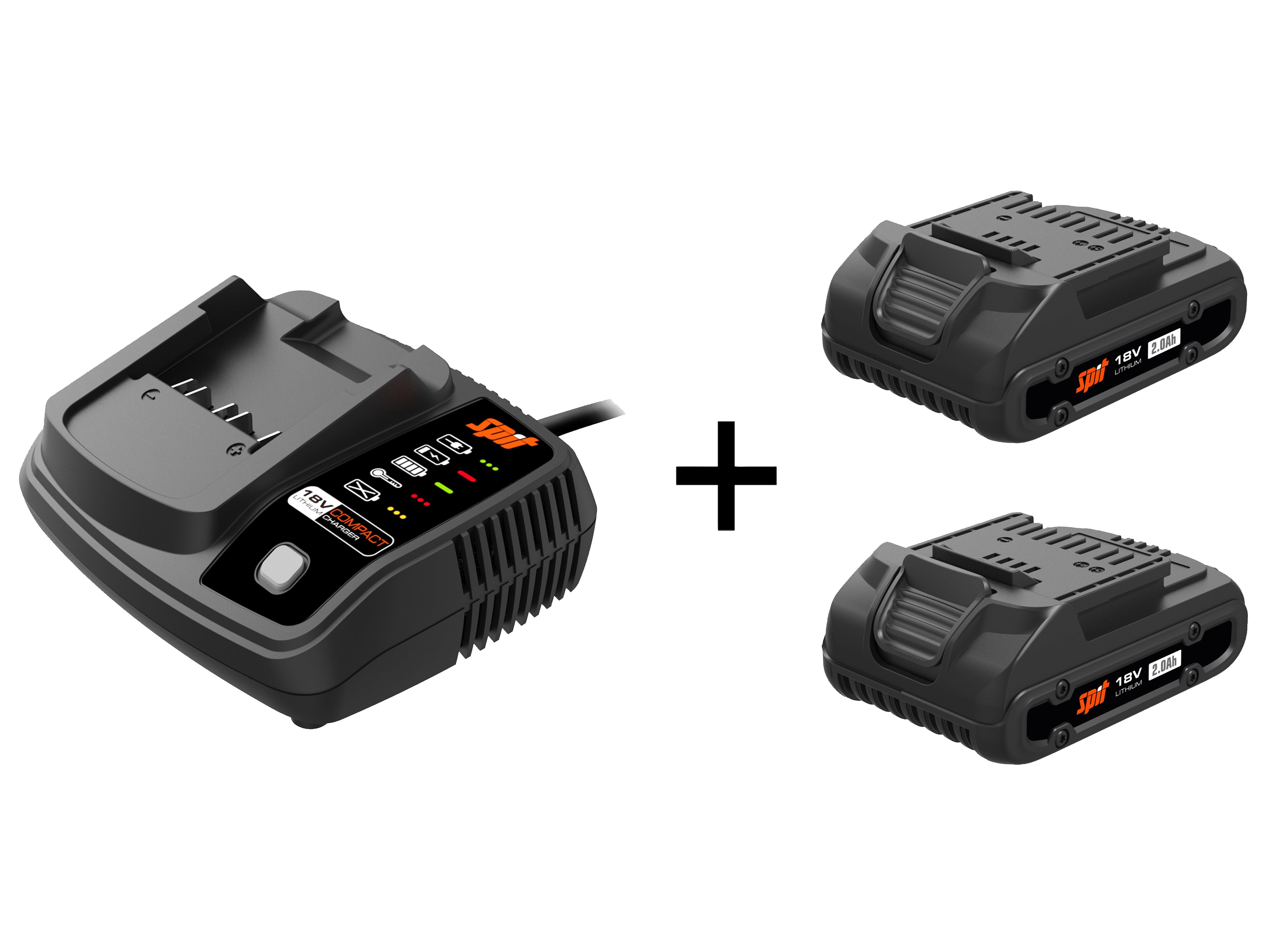 Set bevat: 2x accu’s 18 V/2 Ah en compacte lader – instap-kit voor het SPIT 18 V-platform.