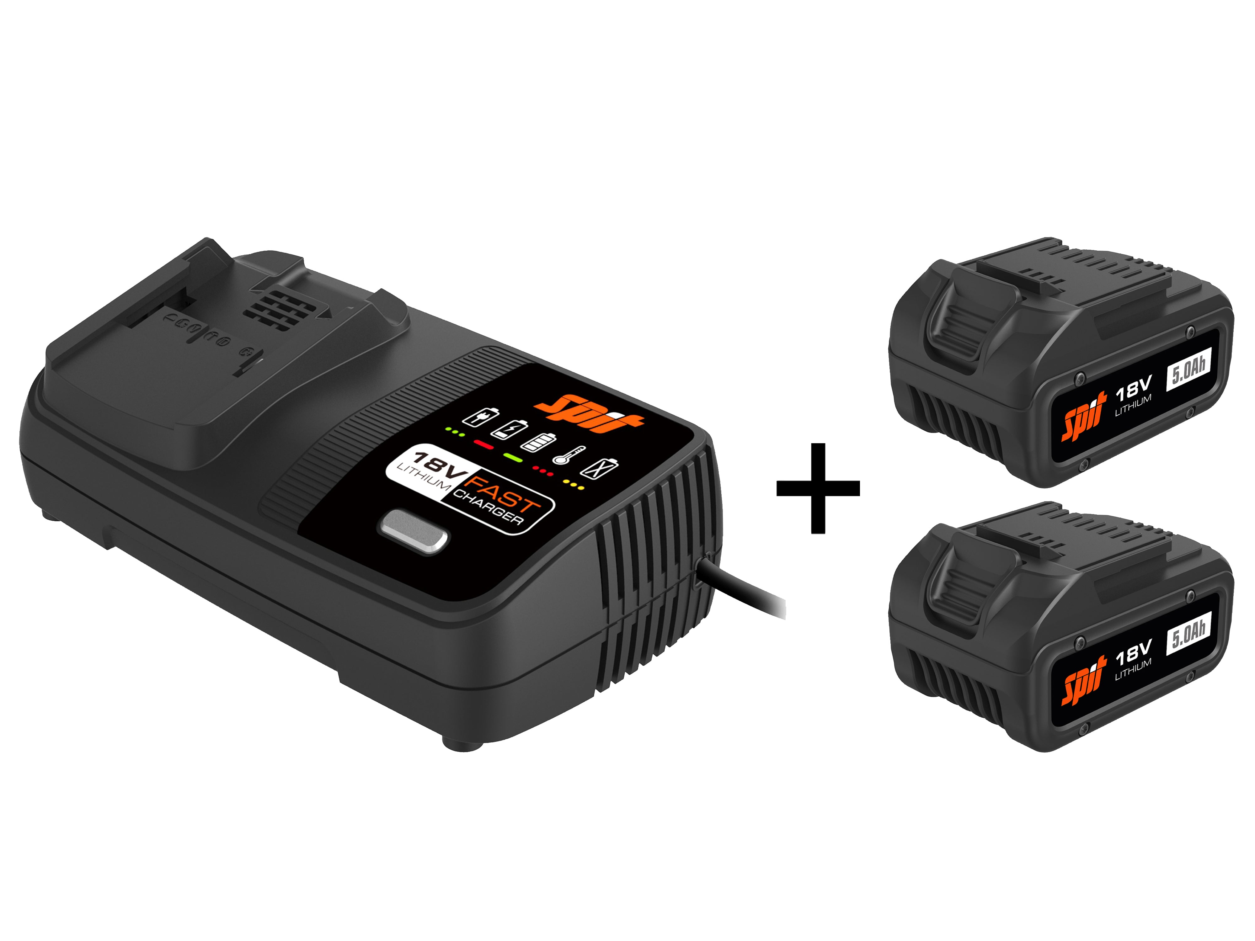 Set bevat: 2× 18V / 5 Ah accu’s + snellader voor het SPIT 18V-platform – ideaal voor continu werk zonder onderbreking.