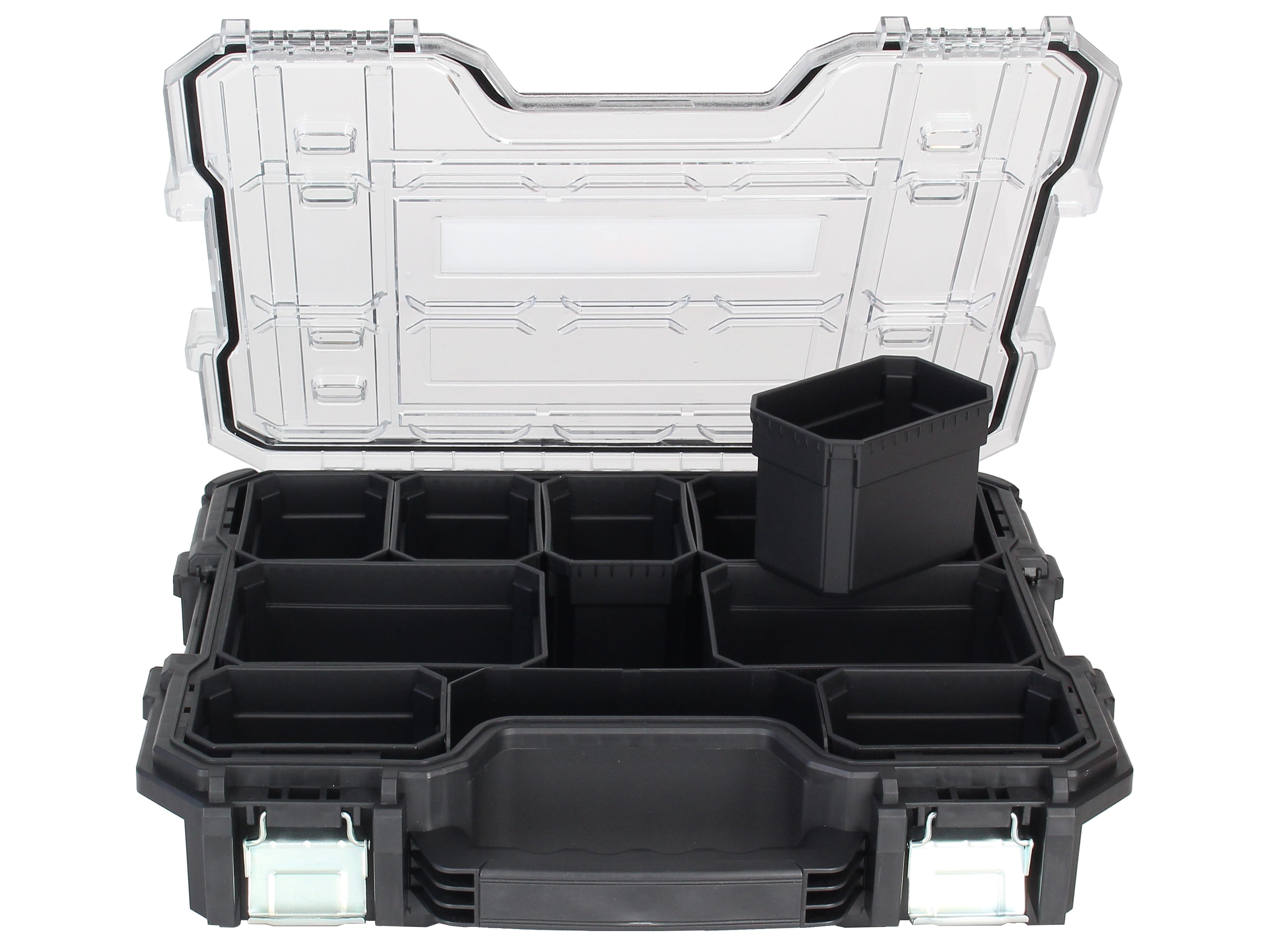 Set bevat: een Mini Keybox‑koffer voor verbruiksartikelen – versterkt kunststof met transparant deksel en vakverdeling, compatibel met 18 V‑platform.