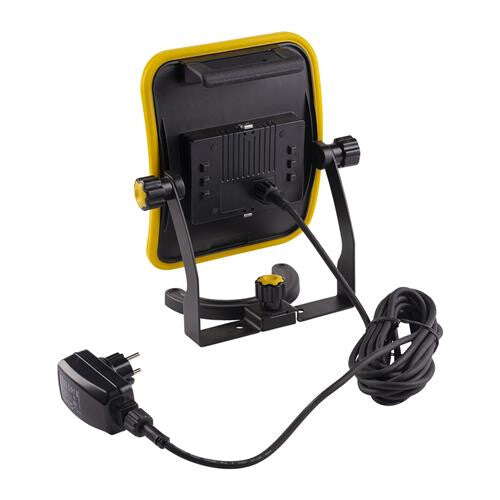 Set bevat: 25W bouwlamp met 2700 lumen, uitneembare accu die ook als powerbank dient, geschikt voor bouwplaatsen en installatiewerkzaamheden, inclusief 5m aansluitsnoer.