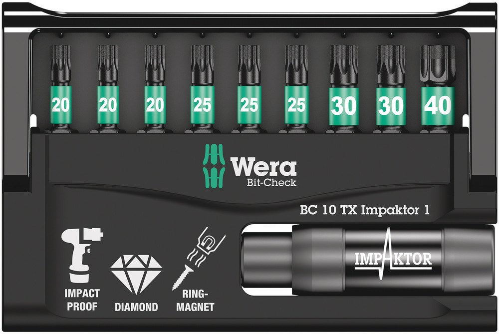 Robuuste Bit-Check van Wera. Bij Bit-Checks heeft u steeds een goed overzicht over het beschikbare gereedschap. Bits die niet nodig zijn voor de werkzaamheden, kunnen in het assortiment worden teruggeplaatst en raken zo niet kwijt. Eenvoudig mee te nemen, bijv. in een borstzak. De Impaktor-technologie zorgt voor een bovengemiddelde gebruiksduur ook onder extreme situaties. Verhoogde wrijvingsweerstand dankzij ruwe diamantdeeltjes op de bitpunt voorkomt het wegglijden uit de schroef. Uitermate geschikt voor gebruik in combinatie met conventionele impact- en slagschroevendraaiers. Impaktor-houder voor het afleiden van extreme belastingspieken. Bijzonder torsie-effect dankzij dubbele torsieveer. Met ringmagneet om ook lange en zware schroeven eenvoudig op de plaats te houden, ideaal voor werkzaamheden boven het hoofd. Uitermate geschikt voor gebruik in combinatie met conventionele impact- en slagschroevendraaiers. Magneet kan teruggeschoven en daarmee uitgeschakeld worden.
